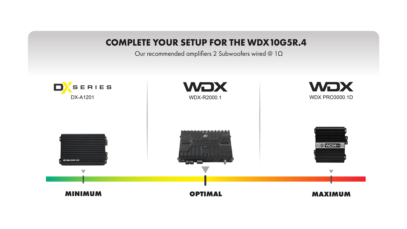 Designed for true bass enthusiasts, the WDX10G5R.4 subwoofers offer unmatched power and precision. • Featuring a custom mounting gasket for a perfect seal, eliminating rear-canceling waves for pure bass. • All-new dust caps and a custom-tooled aluminum basket provide durability, rigidity, and optimal heat dissipation. • The custom ribbed surround and High Excursion motor with Y35 ferrite magnets and high-temperature voice coils deliver deep, distortion-free bass. • Built for Bass: Power handling up to 3000 watts dynamic (1500 watts nominal) The WDX10G5R.4 sets a new standard for earth-shaking bass. Ready to feel the difference?