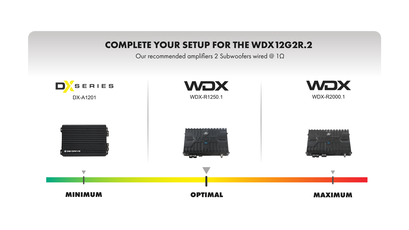 Designed for true bass enthusiasts, the WDX12G2R.2 subwoofers offer unmatched power and precision. • Featuring a custom mounting gasket for a perfect seal, eliminating rear-canceling waves for pure bass. • All-new dust caps and a custom-tooled aluminum basket provide durability, rigidity, and optimal heat dissipation. • The custom ribbed surround and High Excursion motor with Y35 ferrite magnets and high-temperature voice coils deliver deep, distortion-free bass. • Built for Bass: Power handling up to 2500 watts dynamic (1250 watts nominal) The WDX12G2R.2 sets a new standard for earth-shaking bass. Ready to feel the difference?