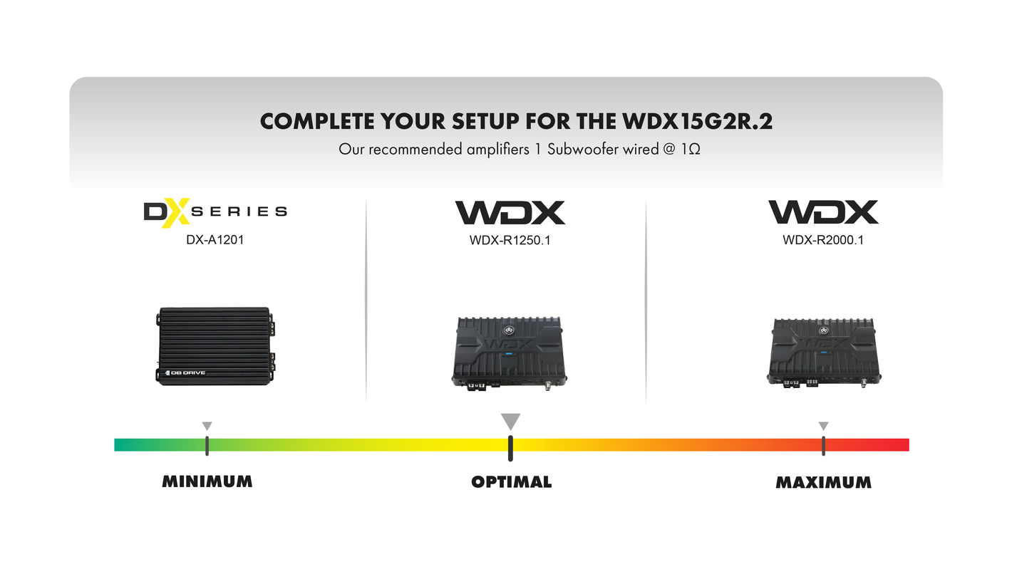 Designed for true bass enthusiasts, the WDX15G2R.2 subwoofers offer unmatched power and precision. • Featuring a custom mounting gasket for a perfect seal, eliminating rear-canceling waves for pure bass. • All-new dust caps and a custom-tooled aluminum basket provide durability, rigidity, and optimal heat dissipation. • The custom ribbed surround and High Excursion motor with Y35 ferrite magnets and high-temperature voice coils deliver deep, distortion-free bass. • Built for Bass: Power handling up to 2500 watts dynamic (1250 watts nominal) The WDX15G2R.2 sets a new standard for earth-shaking bass. Ready to feel the difference?